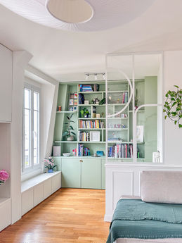 Réalisation de menuiseries sur mesure visant à délimiter les espaces et créer un maximum de rangement.